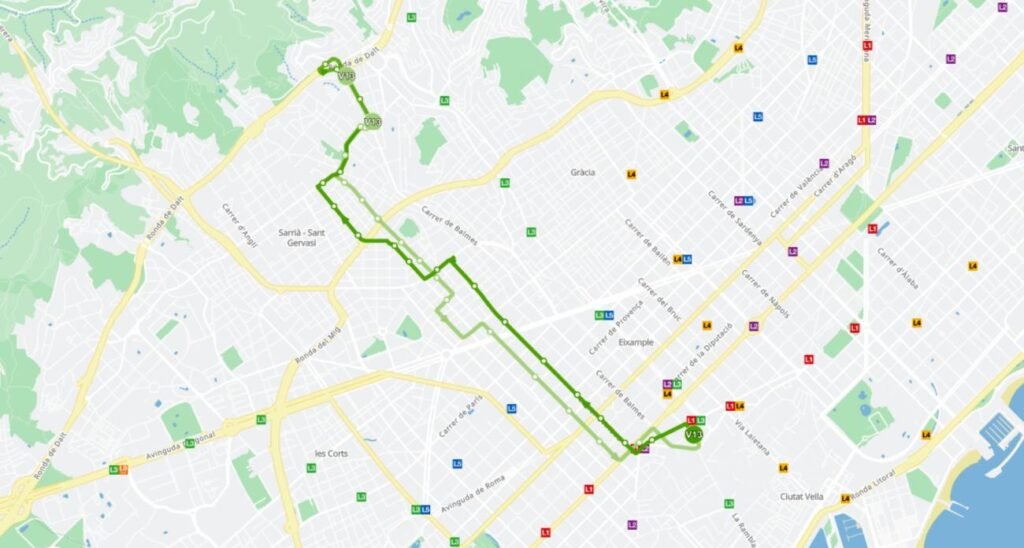 Le bus démarre à l’arrêt Pl. Catalunya – Bergara, situé tout près du sommet des Ramblas et de la station de métro. C’est le point de départ idéal (« Final de trajecte ») pour monter vers les quartiers résidentiels.