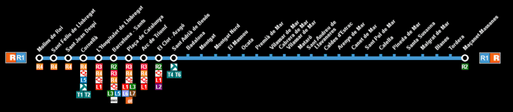 Le dernier R1 quitte généralement la place de Catalogne vers 23h30 en direction de Mataró/Blanes. Pour le retour vers Barcelone, le dernier départ de Blanes se situe souvent autour de 22h00. Vérifiez bien l’appli le dimanche soir !