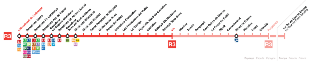 Si la R1 est la ligne bleue de la mer et la R2 l’artère de l’efficacité, la R3 est la ligne verte et sauvage. Elle relie l’agitation urbaine de L’Hospitalet de Llobregat aux paysages alpins de Puigcerdà et Latour-de-Carol, de l’autre côté de la frontière française. 🇫🇷