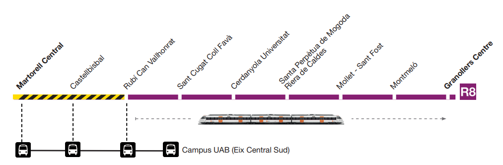 La gare de référence est Cerdanyola Universitat. Elle est située directement sur le campus. C’est ici que la R8 croise la ligne R7 (qui, elle, vient de Barcelone).