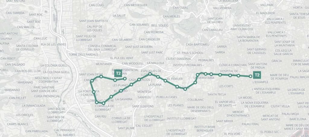 La ligne T2 s’étend de la place Francesc Macià jusqu’à Llevant – Les Planes. Bien qu’elle sorte techniquement des limites communales de Barcelone pour entrer dans des municipalités comme Esplugues ou Sant Joan Despí, elle reste entièrement située en Zone 1.